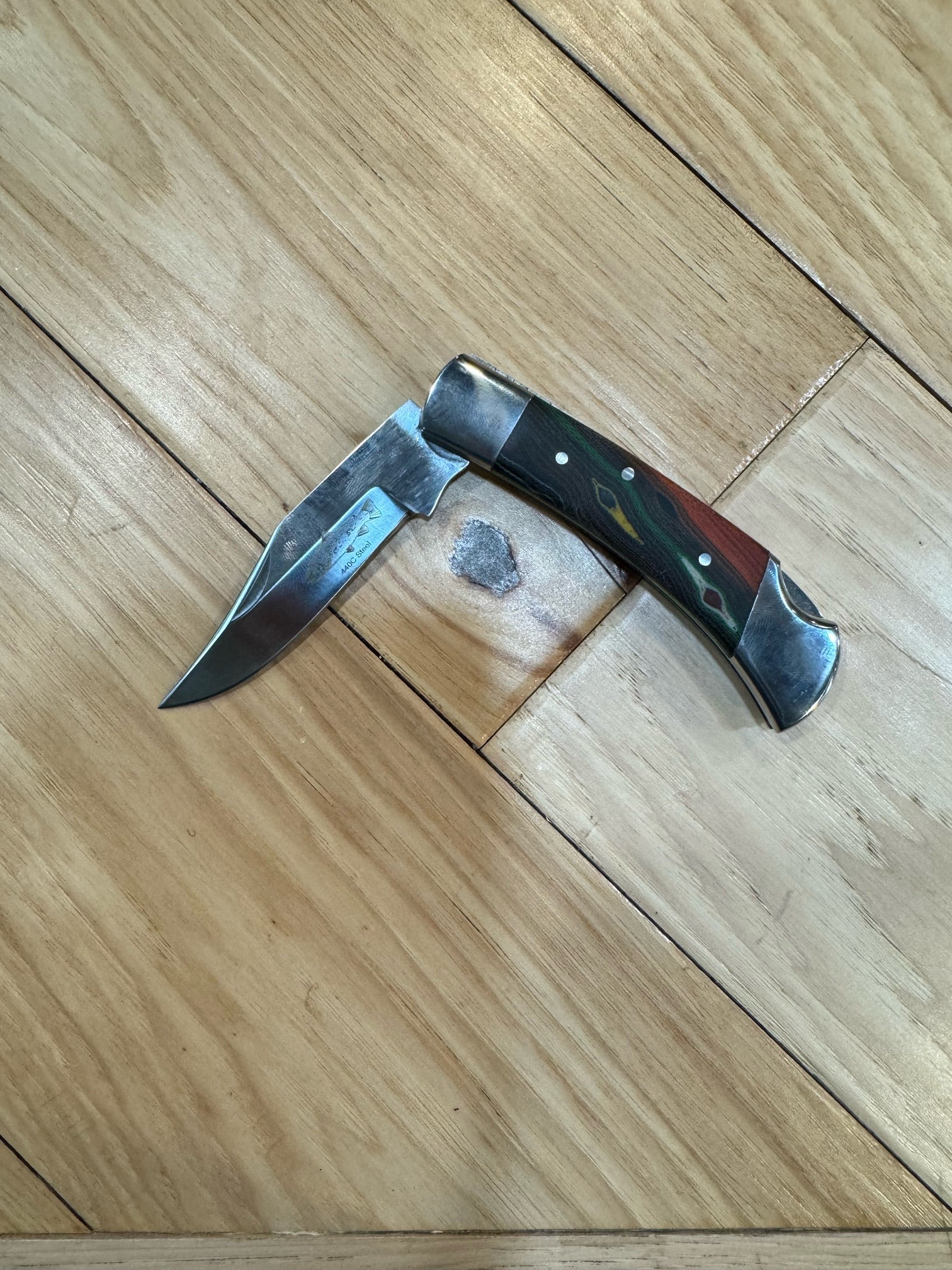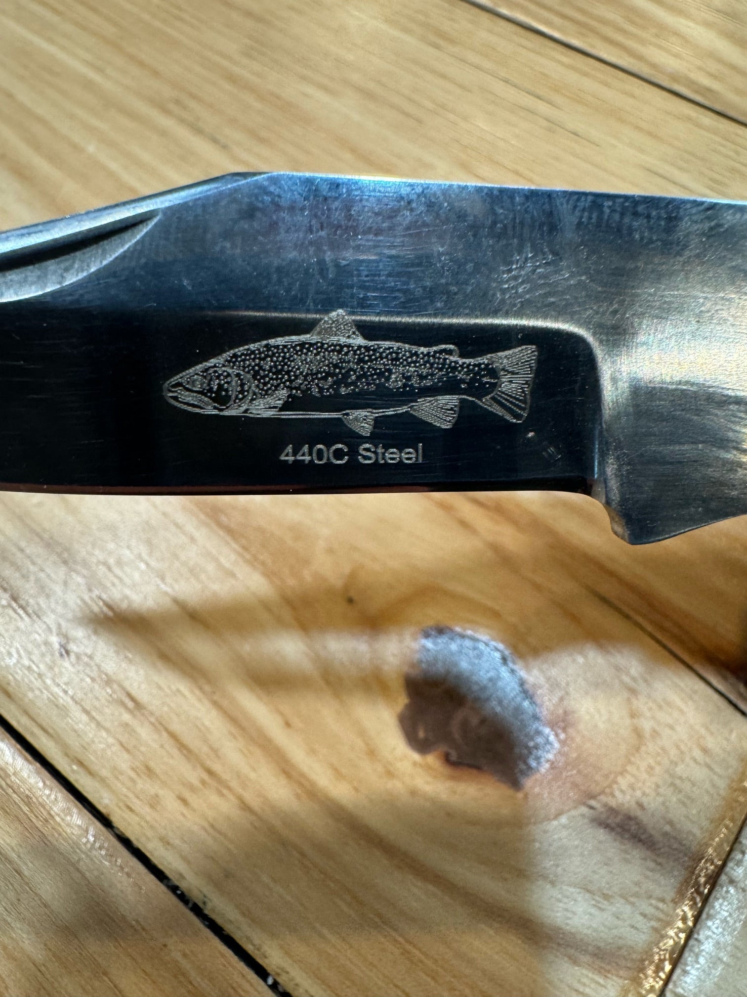 Lock-back folding knife with Micarta handle and a 440c stainless steel blade. The Micarta is themed after a Brown trout. The blade also features a laser etched Brown Trout right on the blade with our logo etched onto the opposite side.